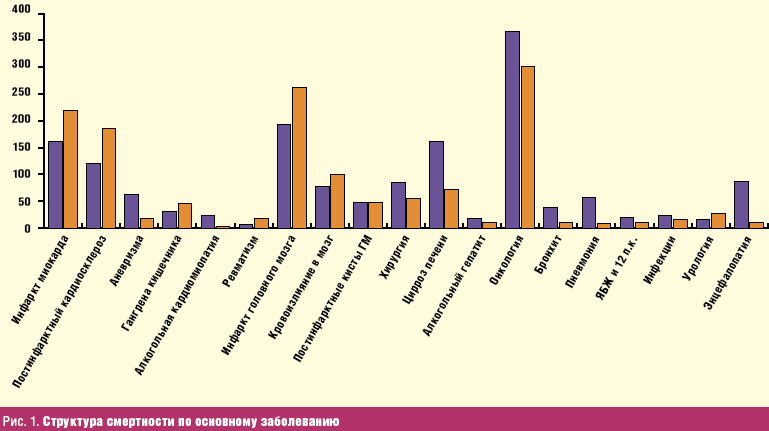 С целью определения частоты встречаемости сахарного диабета и его роли в прогнозе пациентов с соматической патологией, в одном из крупных стационаров г. Москвы были проанализированы протоколы патолого-анатомических вскрытий за 2006–2008 гг. При этом было выявлено, что из 3239 умерших дестабилизация кардио- и цереброваскулярной патологии стала причиной смерти 1510 больных. Таким образом, удельный вес кардиоваскулярной патологии в структуре общей смертности составил 46,6% (Верткин А. Л., Скотников А. С., 2008) (рис. 1).