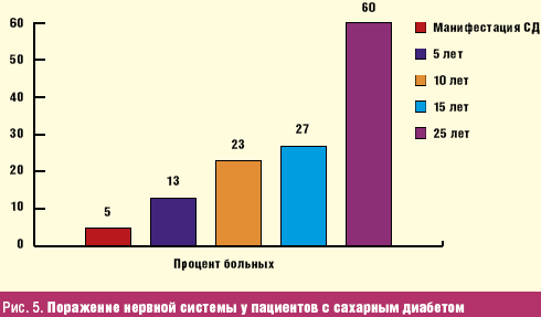 Так, у 5% пациентов с манифестацией сахарного диабета уже имеются симптомы поражения нервной системы, которые с увеличением длительности заболевания возрастают, составляя 60% при сроке диабета более 25 лет (рис. 5).