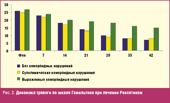 По данным динамики суммарного балла HAM-A, достоверное уменьшение тревоги отмечалось во всех временных точках (7, 14, 21, 28, 35 и 42 дня от начала приема Рексетина). Темп снижения симптоматики, одинаковый во всех группах в течение первых двух недель терапии, далее замедлялся в группе пациентов с выраженными коморбидными нарушениями, тогда как в группах пациентов без коморбидных нарушений и с субклиническими коморбидными нарушениями терапевтический эффект неуклонно нарастал, достигая максимального уровня к концу исследования. К моменту завершения курса терапии регресс тревожной симптоматики в группах пациентов без коморбидных нарушений и с субклиническими коморбидными нарушениями был достоверно больше, чем в группе пациентов с выраженными коморбидными нарушениями [6]. Таким образом, данное исследование подтверждает сведения о высокой эффективности Рексетина в лечении ГТР. Противотревожное действие препарата начинает проявляться уже с первых дней терапии и плавно нарастает, достигая максимума через месяц лечения. Доза 20 мг представляется адекватной в большинстве случаев, в то же время при ГТР, осложненном коморбидными эмоциональными расстройствами, доза Рексетина, по-видимому, должна быть повышена [6].
