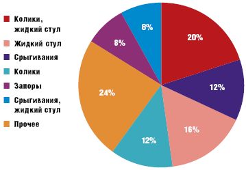 У детей, находящихся на грудном вскармливании, следует провести коррекцию состава материнского молока, что, во многих случаях, достигается оптимизацией пищевого рациона матери [6]. В частности, жиры животного происхождения в рационе питания матери следует частично заменить растительными маслами, с учетом хорошо известных данных о способности растительных масел стимулировать двигательную активность кишечника и определяющем влиянии жирового состава рациона матерей на жировой состав женского молока. В питание кормящей матери следует шире включать продукты с высоким содержанием пищевых волокон (овощи, фрукты, крупы, хлеб грубого помола и др.), которые обладают послабляющим действием, что также может оказать благоприятное влияние на моторику кишечника ребенка. В то же время запоры у детей на грудном вскармливании, особенно у детей первых месяцев жизни, могут быть проявлением лактазной недостаточности [7, 8]. В частности, в наших исследованиях у 25 детей первых трех месяцев жизни с лактазной недостаточностью (подтвержденной на основании исследования уровня экскреции углеводов с калом), находящихся на грудном вскармливании, запоры наблюдались у 16% обследованных детей, причем у 8% детей они были основной и единственной жалобой (рис. 1).