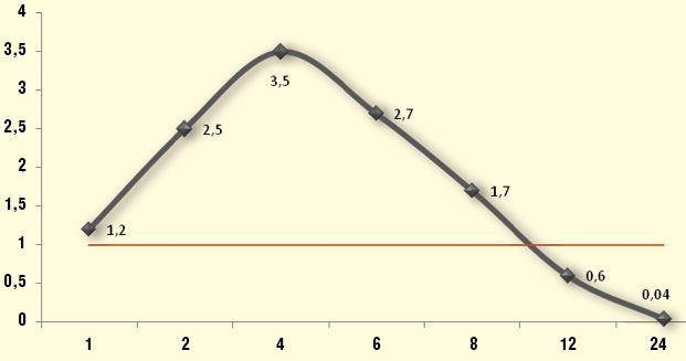 Цефиксим продемонстрировал достаточную антипневмококковую активность и в фармакодинамической/фармакокинетической модели. Показано, что симуляция воздействия реально достижимой сывороточной и тканевой концентрацией обеспечивает, к 12 часу, уверенное подавление роста микроорганизмов (рис. 2). В клинической практике это означает купирование инфекционно-воспалительного процесса, в том числе за счeт оптимизации саногенетических процессов на фоне блокированной логарифмической фазы роста бактерий.