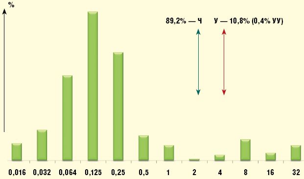 Отобрано 250 респираторных штаммов S. pneumoniae. Структура клинического материала и обобщенные результаты определения чувствительности S. pneumoniae представлены в табл., распределение минимальных подавляющих концентраций цефиксима — на
