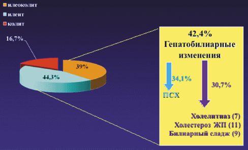 Из 210 наблюдаемых больных изменения желчевыводящих путей были выявлены у 89 (42,4%). В спектре обнаруженных изменений, кроме первичного склерозирующего холангита (34,1%), обращали на себя внимание билиарный сладж, холестероз желчного пузыря и ЖКБ. На долю этой патологии пришлось 30,7% выявленных изменений.