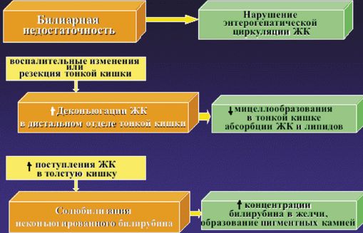 - усиление процессов деконъюгации желчных кислот в дистальном отделе тонкой кишки, обусловленное воспалительными изменениями в тонкой кишке или ее резекцией. Следствием этого является снижение мицеллообразования в тонкой кишке, ведущее к уменьшению абсорбции как самих желчных кислот, так и липидов;