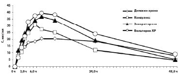 В исследовании А. В. Соколова и соавт. (2006) убедительно доказаны достоверные отличия фармакокинетических показателей различных форм ПВК с контролируемым высвобождением активного вещества [7]. Согласно полученным данным, наиболее адекватным по фармакокинетическим характеристикам оказался Депакин Хроно, динамика концентрации и режим дозирования которого полностью соответствовали заявленным фирмой-производителем. Фармакокинетические параметры других препаратов — Конвулекс, Вальпарин ХР и Энкорат Хроно — существенно отличались: они быстрее всасывались, скорость достижения максимальной концентрации в плазме крови (Сmax) была более высокой, препарат быстрее выводился из организма. Проведение терапевтического лекарственного мониторинга выявило их неэквивалентность Депакину Хроно, и, как следствие, были даны рекомендации по уменьшению разовой/суточной дозы и более частому приему ПЭП. При этом для Конвулекса разовая доза должна составлять 410 мг вместо 500 мг, а очередная доза препарата должна быть принята через 8,23 ч, а не через 12 ч, как заявлено в аннотации. Концентрации различных вальпроатов после приема однократной дозы представлены на рис.