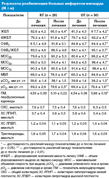 Для сравнительного изучения эффективности медицинской реабилитации больных ИМ в функционально-восстановительном периоде все обследованные были разделены методом случайной выборки на основную и контрольную группы. Реабилитационная программа 20 больных контрольной группы (КГ) включала режимы: щадящий (I), щадяще-тренирующий (II) или тренирующий (III) — в зависимости от состояния больного; диету № 10 с ограничением животных жиров; климатолечение в виде аэротерапии; лечебную гимнастику; дозированную ходьбу; физиотерапевтические процедуры: магнитотерапию, лазеротерапию, массаж шейно-грудного отдела позвоночника по щадящей методике. Медикаментозное лечение назначалось по показаниям и включало прием бета-блокаторов, антагонистов кальция и нитратов. Программа реабилитации 30 больных основной группы (ОГ) дополнительно включала прием «Кардио Капилар с коэнзимом Q10» 500 мг по 1 таблетке 3 раза во время приема пищи в течение 21 дня. Статистическая обработка материала проведена с помощью программы STATISТ на ПЭВМ.